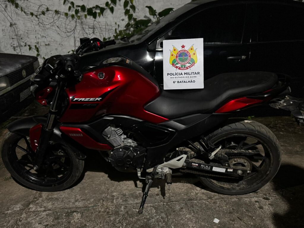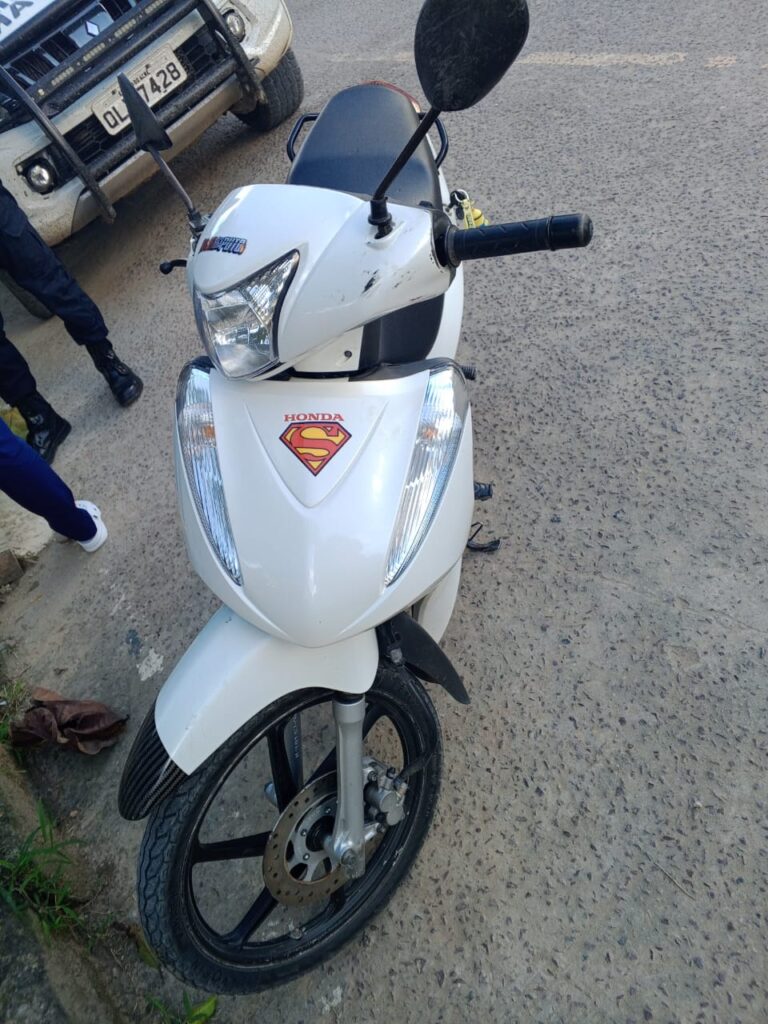 Em Marechal Thaumaturgo, uma motocicleta modelo Biz branca também foi recuperada. O veículo estava com a placa adulterada, o que levantou suspeitas dos policiais. Após a verificação, foi constatado que a placa não correspondia à identificação real da moto, que também apresentava restrição de roubo.