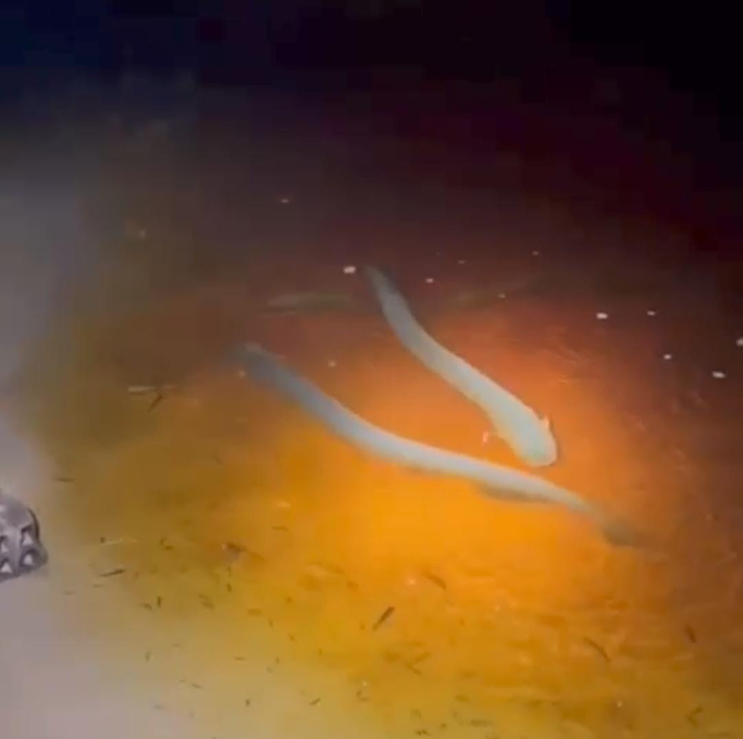 Um vídeo que circula em grupos de WhatsApp, mostra três peixes elétricos, conhecidos como “poraquês”, nadando durante a noite, no Igarapé Preto, em Cruzeiro do Sul.
