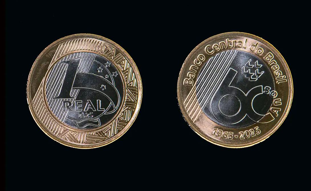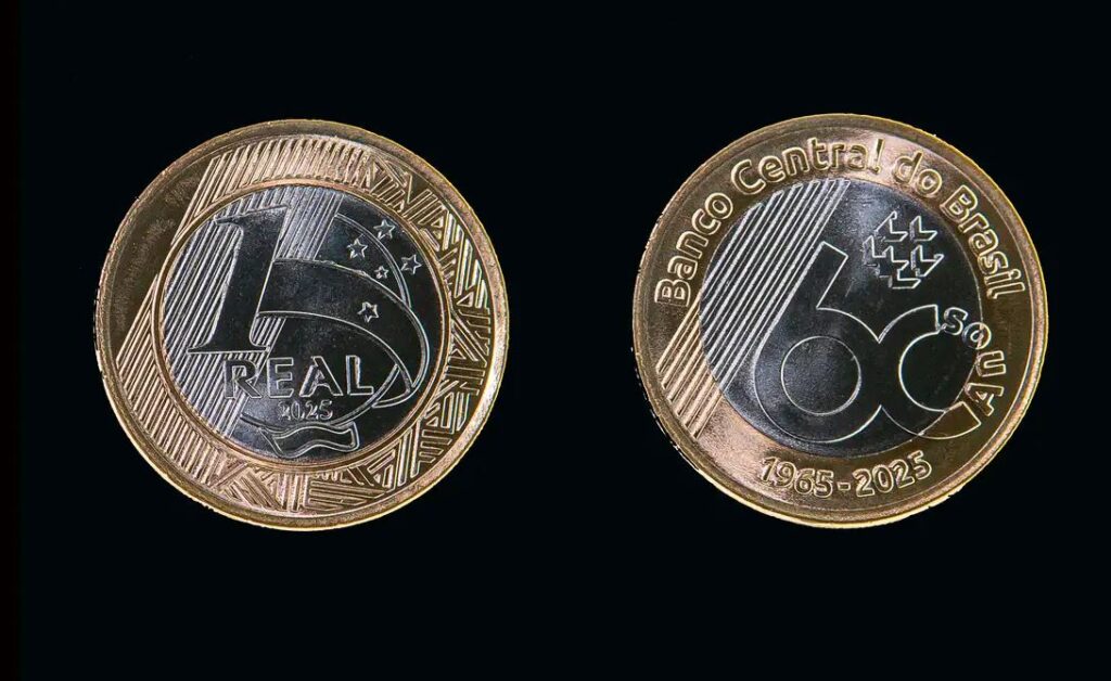 No anel dourado, aparecem as legendas “Banco Central do Brasil” e “1965–2025”. O reverso (parte de trás) seguirá o padrão da segunda família das moedas do tipo, em que aparece o valor de face de R$ 1.