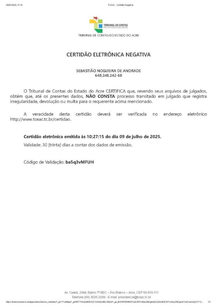 O Tribunal de Contas do Estado do Acre (TCE-AC) emitiu, nesta Quarta-feira (9), uma certidão negativa em nome do prefeito de Porto Walter César Andrade, confirmando que não há qualquer processo com trânsito em julgado contra o gestor municipal ao longo de seus cinco anos de mandato.