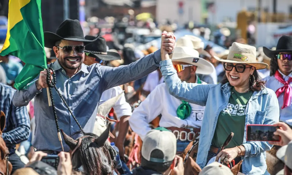 O governador Gladson Cameli é a vice-governadora do Acre, Mailza Assis, concederam entrevista coletiva na manhã deste sábado, 26, durante a abertura da Cavalgada, evento que marca oficialmente o início da Expoacre 2025.