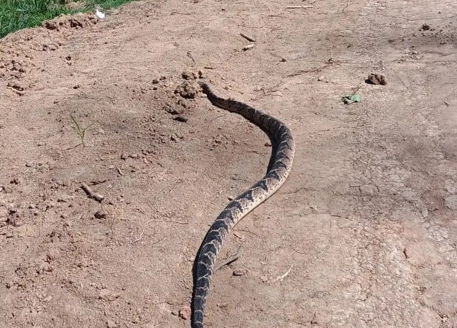 Segundo relatos enviados ao Radar 104, a cobra, identificada como uma surucucu-pico-de-jaca, considerada a maior serpente peçonhenta da América Latina e uma das mais venenosas do mundo, surpreendeu moradores que transitavam pela região.