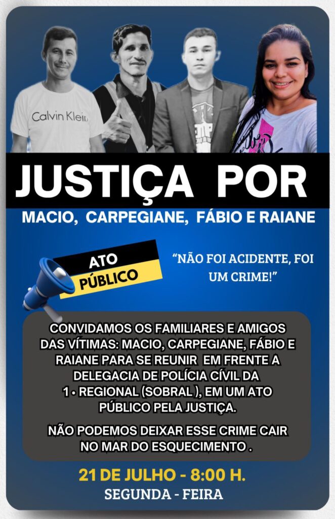 “Não foi acidente, foi um crime!” — é com esse lema que familiares e amigos das vítimas Macio, Carpegiane, Fábio e Raiane convocam um ato público por justiça. A manifestação está marcada para a próxima segunda-feira, 21 de julho, às 8h da manhã, em frente à Delegacia de Polícia Civil da 1ª Regional, na baixada da Sobral em Rio Branco.