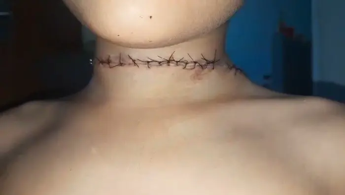 Théo foi atendido com urgência e precisou levar 20 pontos no pescoço. Apesar da recuperação física, a família relata que o trauma emocional persiste.