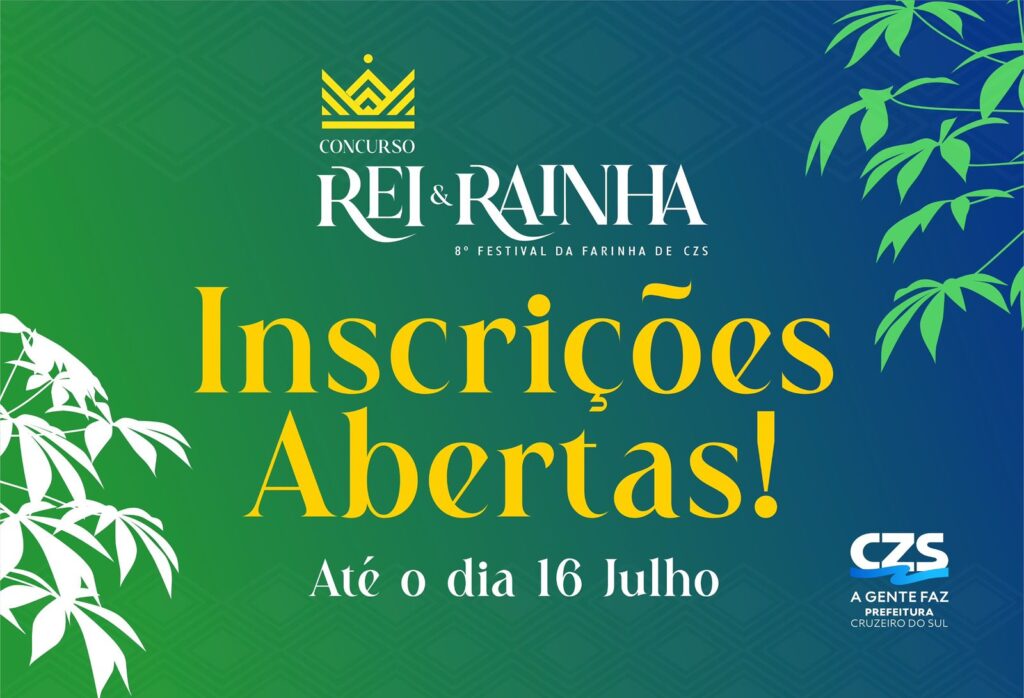 A Prefeitura de Cruzeiro do Sul, por meio da Secretaria Municipal de Cultura, abriu as inscrições para o concurso Rei e Rainha da Farinha 2025 que seguem abertas até o dia 16 de julho e devem ser feitas presencialmente na sede da Secretaria Municipal de Cultura, localizada no centro da cidade.