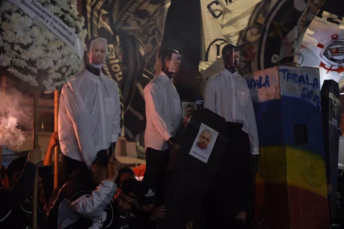 Torcedores organizados do Corinthians protestaram contra dirigentes do clube nesta quinta-feira, no Parque São Jorge, onde simularam o velório do presidente afastado Augusto Melo e do ex-presidente Andrés Sanchez, além de cartolas como Duílio Monteiro Alves, Roberto de Andrade e Mário Gobbi. Fotos dos alvos do protesto foram coladas em caixões, com labaredas de fogo em suas quinas, e bonecos.