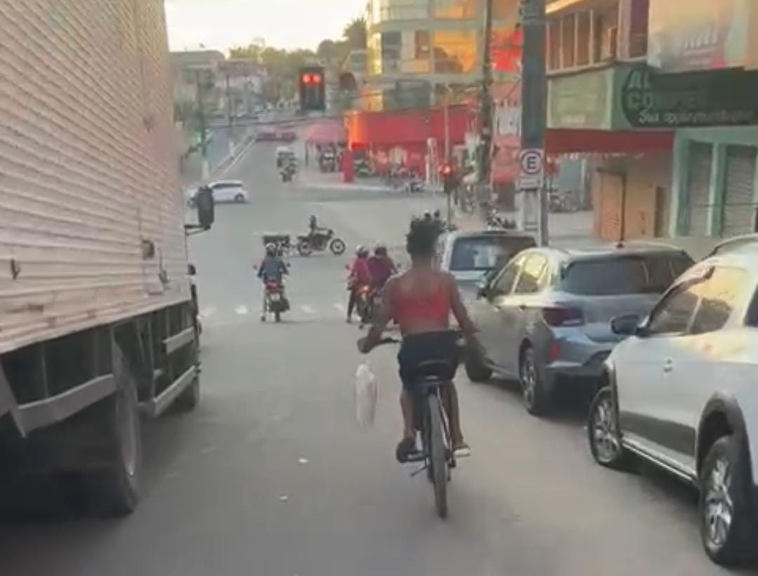No momento da descida, ele quase perde o controle da bicicleta e batia em uma motocicleta, parada no sinal.