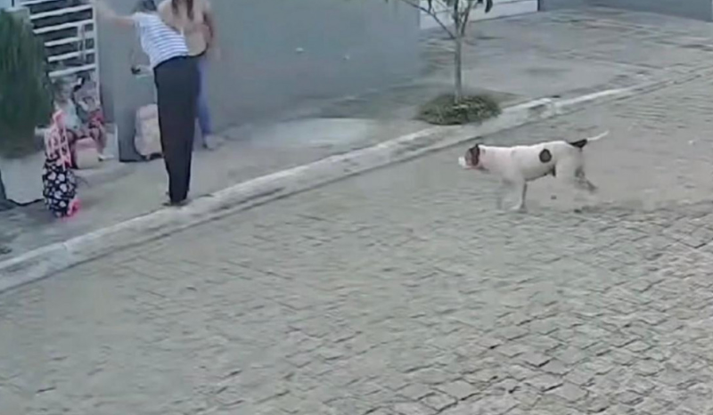 No vídeo é possível ver que as mulheres e as crinaças estavam em frente à casa aguardando o tranporte. Em seguida, o cachorro apareceu em um terreno baldio, atravessou a rua e se aproximou das crianças, que foram puxadas pelas mães.