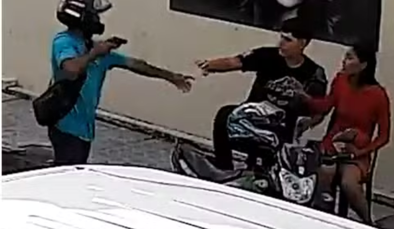 Nas imagens, é possível perceber que um casal está sentado em uma calçada quando a dupla chega em uma moto e tenta cometer o assalto. O jovem se recusa a entregar o celular e o criminoso atira na cabeça da vítima, que é ferida e cai no chão.