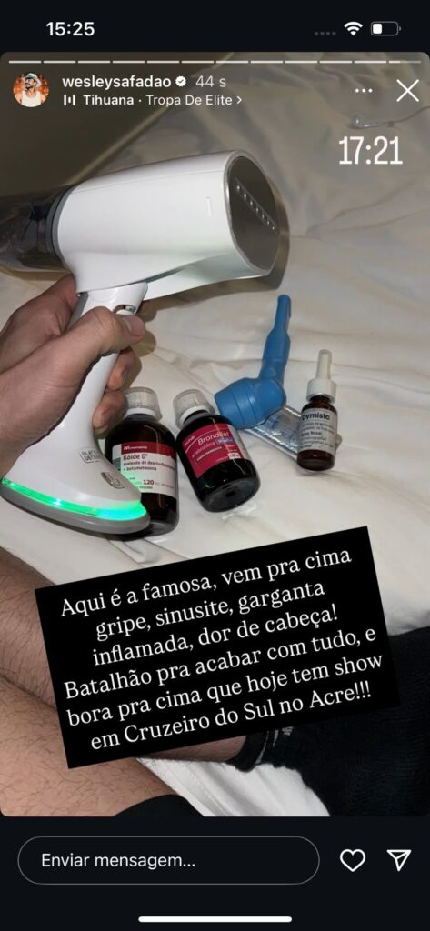 “Aqui é a famosa ‘vem pra cima’: gripe, sinusite, garganta inflamada, dor de cabeça! Batalhão pra acabar com tudo, e bora pra cima que hoje tem show em Cruzeiro do Sul no Acre!”, escreveu Safadão em uma postagem nos stories do Instagram, mostrando que está tomando medicamentos para aliviar os sintomas.