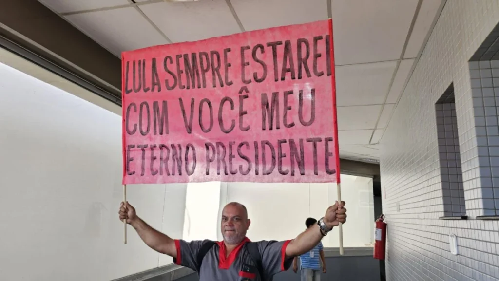O apoiador também levou um cartaz da campanha de 2018, quando o presidente lula apoiou Fernando Haddad/Foto: ContilNet