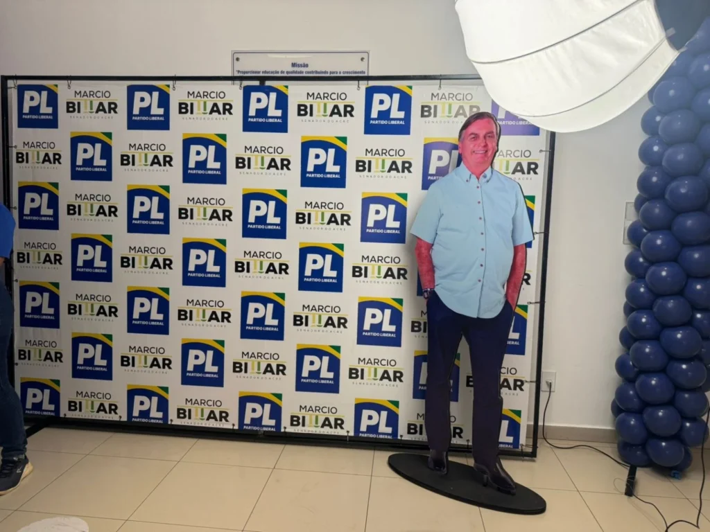Duas estatuetas do exato tamanho do ex-presidente Jair Bolsonaro foram colocadas no ato de filiação do senador Marcio Bittar ao Partido Liberal (PL), nesta sexta-feira (22).