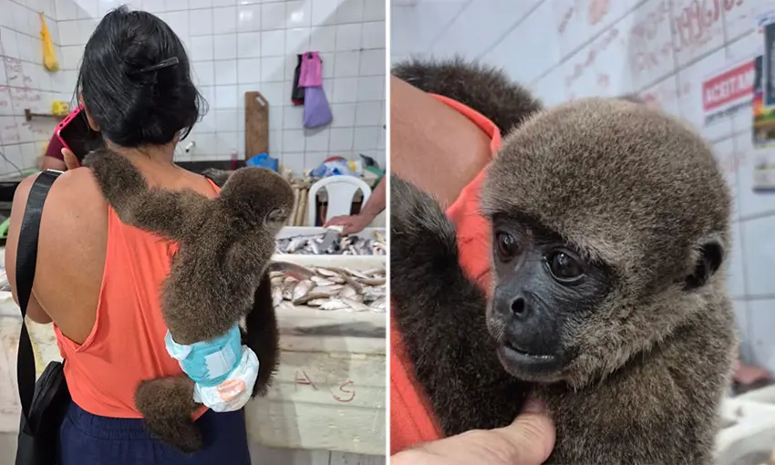 Uma cena inusitada chamou a atenção de quem passou pelo Mercado do Peixe, em Cruzeiro do Sul (AC), na manhã desta quarta-feira, 6. Uma mulher foi flagrada fazendo compras acompanhada de um pequeno macaco, que estava apoiado em suas costas — e usava fraldas.