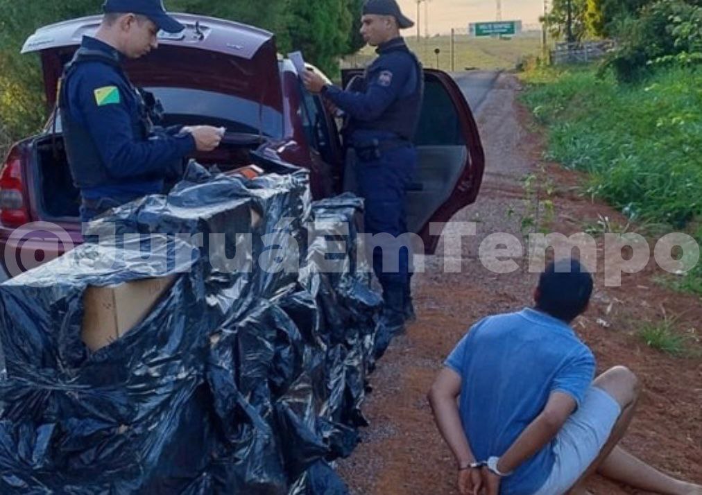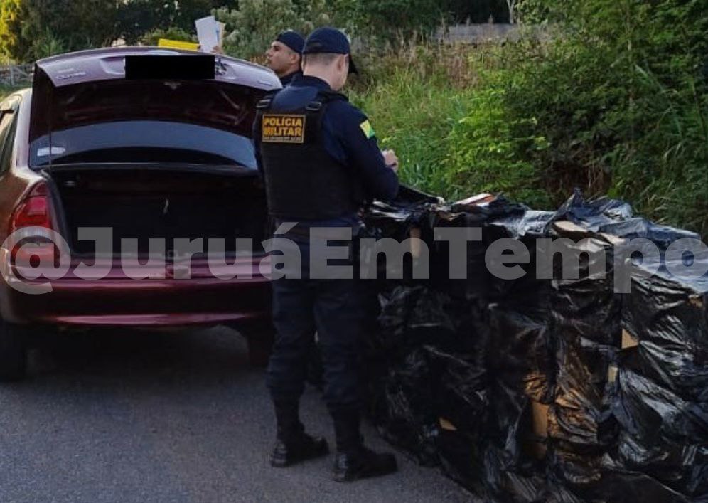 De acordo com a corporação, um automóvel Chevrolet Classic, de cor vermelha e placas M-*2, conduzido por G.S.C., de 31 anos, foi parado para fiscalização. Na vistoria, os militares localizaram 26 caixas de cigarros — cada uma com 25 maços — totalizando 650 maços do produto.