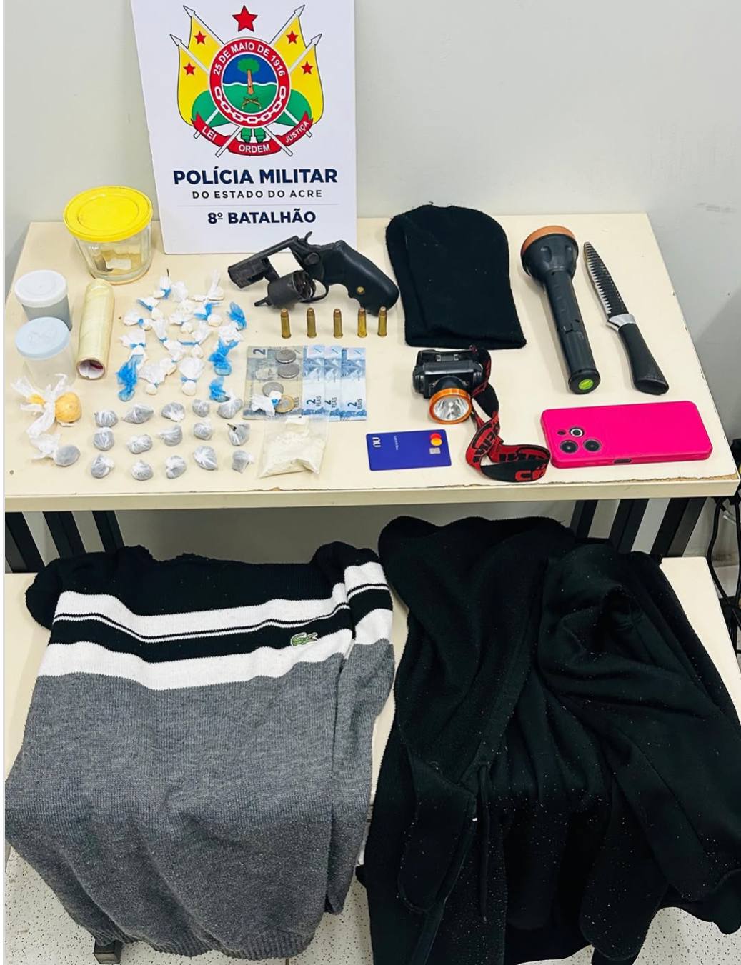 Durante a abordagem, os policiais encontraram com os suspeitos: 1 revólver calibre .38 com 5 munições intactas, 9 gramas de uma substância esbranquiçada aparentando ser cocaína, 17 gramas de uma substância esverdeada semelhante à maconha, 13 gramas de crack, 1 faca, 2 lanternas, toucas e agasalhos com capuz.