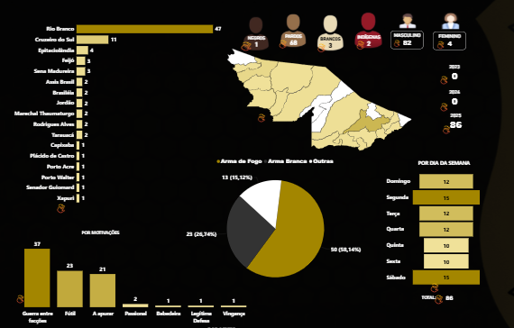 Nos primeiros sete meses de 2025, o Acre registrou 86 homicídios, segundo dados do painel de registros da Polícia Civil do Estado.