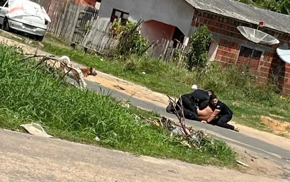 Uma imagem registrada no local mostra o momento em que o homem é imobilizado no chão por dois policiais, evidenciando a tensão da abordagem.
