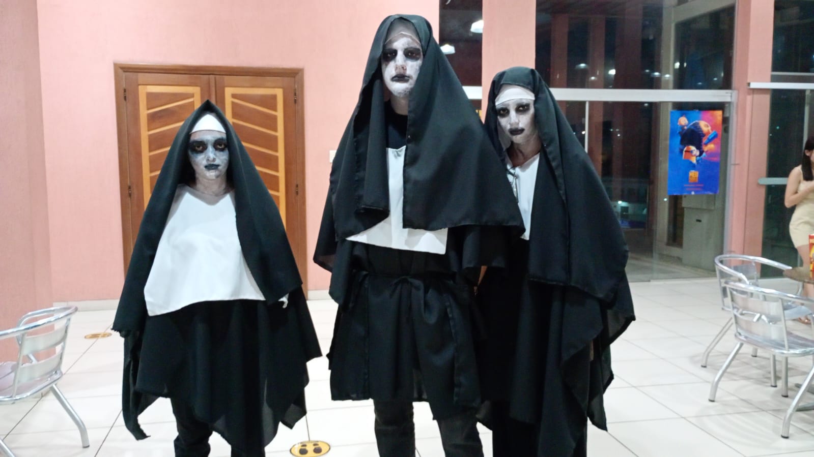 Na noite de domingo (7), três fãs roubaram a cena ao aparecerem fantasiados de freira, arrancando olhares e deixando o clima ainda mais imersivo para quem aguardava a exibição.