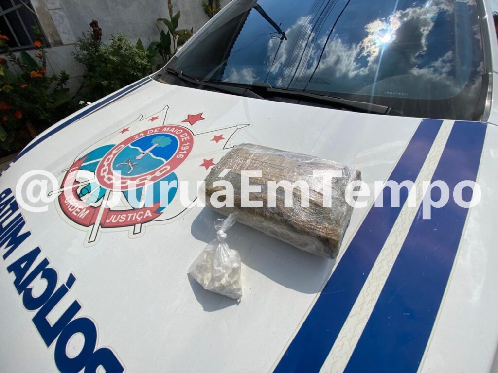 Os policiais voltaram na rua do Passeio, e localizaram em cima do telhado da residência, um saco preto contendo um tijolo de entorpecente do tipo maconha, que ao pesar totalizou 1.30 kg da droga. Na busca pessoal, foi encontrado escondido no bolso do detido, um invólucro com 50 gramas de cocaína.