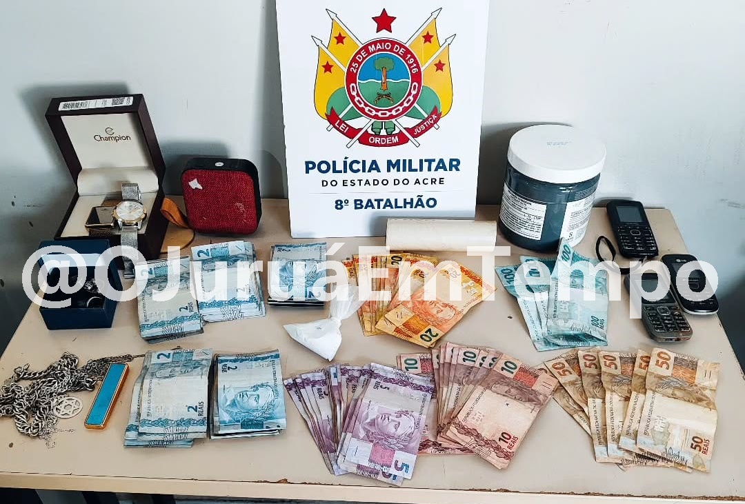 Durante a revista na residência dos suspeitos, os agentes encontraram dinheiro em espécie, porções de substância semelhante à cocaína e aparelhos celulares. O homem e a mulher foram conduzidos à Delegacia de Polícia Civil, onde permanecem sob custódia, aguardando os desdobramentos judiciais.