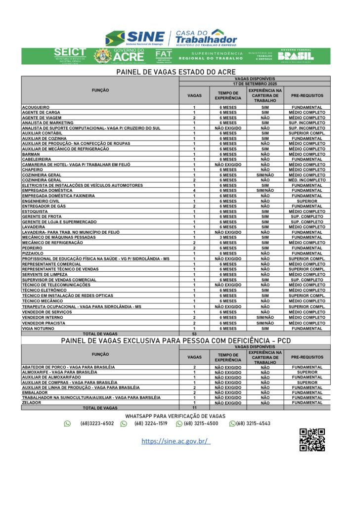 O Sistema Nacional de Emprego (Sine) do Acre divulgou nesta quarta-feira (17) um novo painel com 64 vagas de trabalho disponíveis em Rio Branco. As oportunidades contemplam diferentes níveis de escolaridade, do ensino fundamental ao superior, abrangendo diversos perfis profissionais.