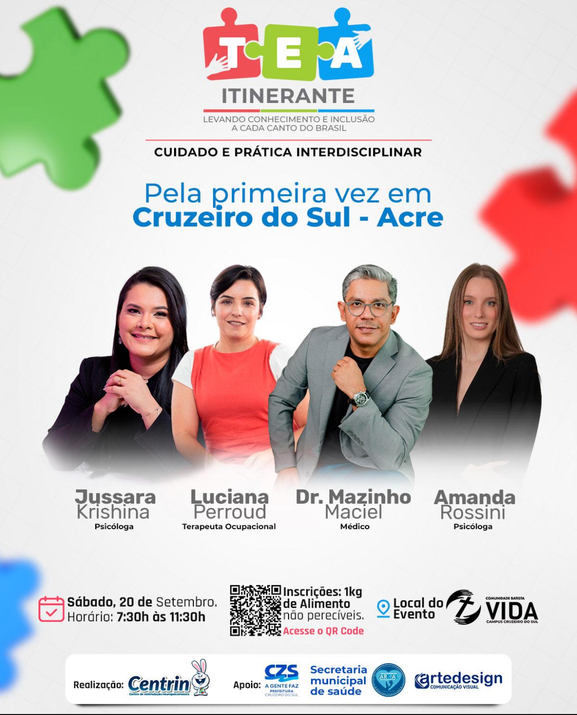 Pela primeira vez, Cruzeiro do Sul será palco do projeto TEA Itinerante, uma iniciativa que vem ganhando destaque por democratizar o acesso ao conhecimento sobre o Transtorno do Espectro Autista (TEA). O evento acontece no dia 20 de setembro, das 7h30 às 11h30, na Comunidade Batista Vida, e promete ser uma manhã de aprendizado, acolhimento e troca de experiências entre famílias, profissionais e interessados no tema.