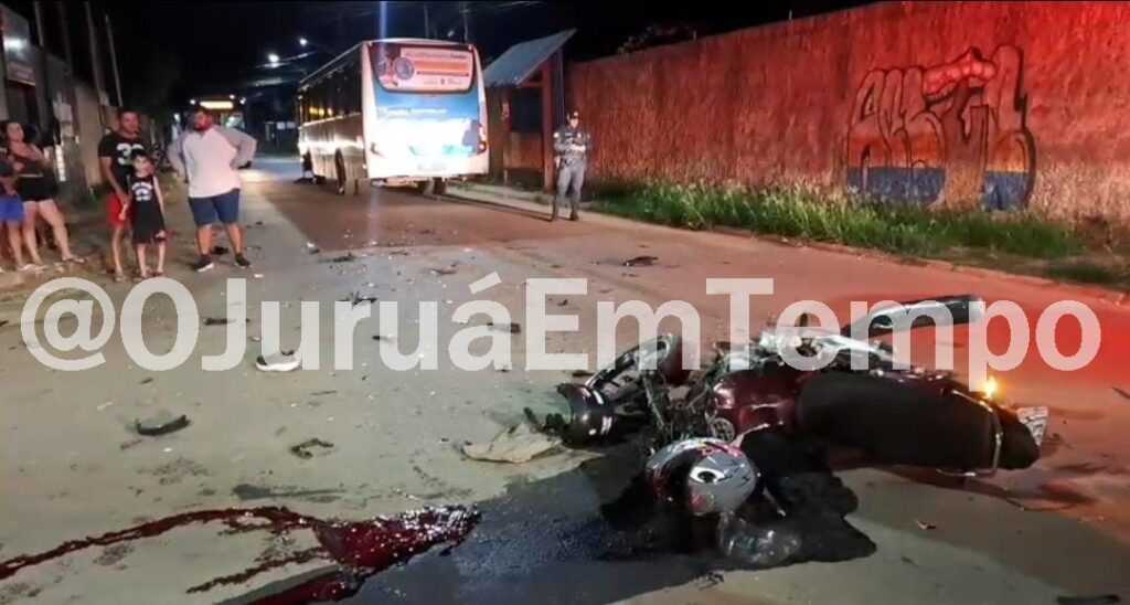 Um grave acidente de trânsito deixou o jovem Ray Silva da Costa, de 20 anos, em estado gravíssimo na noite desta quarta-feira (22), no bairro Mocinha Magalhães, em Rio Branco. O sinistro envolveu uma motocicleta Honda CG 160 Start, de cor vermelha e placa QLY-2531, e um ônibus da empresa Ricco, no cruzamento das ruas Laranja e Ingá.