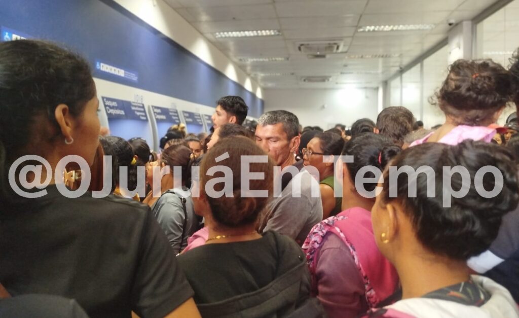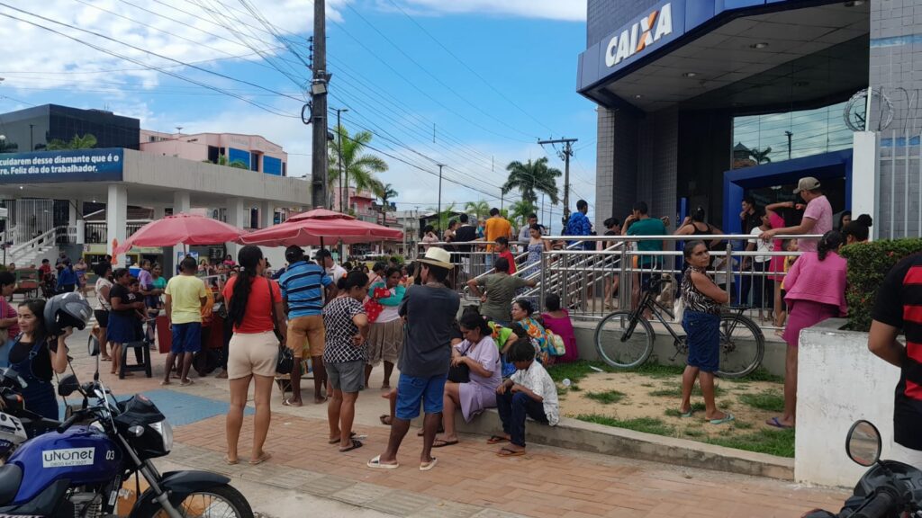 Uma moradora resumiu o sentimento geral diante da aglomeração: “Pelo amor de Deus, a Caixa Econômica tá mais lotada do que sardinha em lata, pelo amor de Deus.”