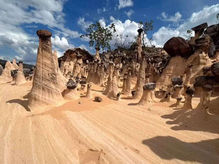 Uma formação geológica rara, chamada “chaminés de fada”, foi identificada pela primeira vez no Brasil, no município de Campos Belos, no nordeste de Goiás. A descoberta foi feita por pesquisadores da Universidade Federal de Goiás (UFG) em uma área particular ainda não aberta à visitação pública.