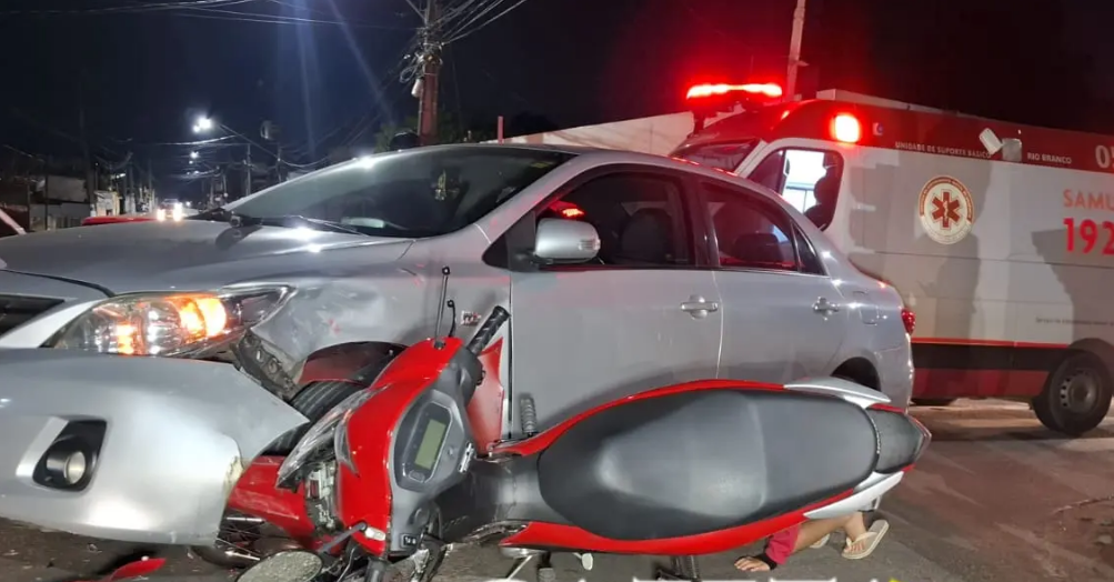 Duas pessoas ficaram feridas após uma colisão entre uma motocicleta Honda Biz e um Toyota Corolla na noite deste domingo, 5, no cruzamento das ruas Saldanha Marinho e Izaura Parente, no bairro Estação Experimental, em Rio Branco.