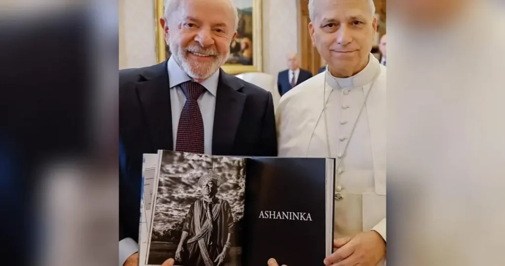 Lula entregou ao pontífice da Igreja Católica o livro “Povos originários, guerreiros do tempo’, do repórter fotográfico Ricardo Stuckert, no qual aparece o registro do líder Ashaninka Antônio Piyãko, referência na defesa da Amazônia.