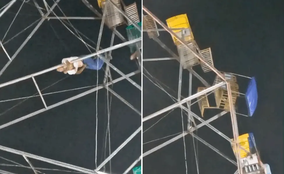 Uma mulher caiu parcialmente de uma das cabines da roda gigante do parque de diversões e ficou pendurada a vários metros de altura, enquanto pessoas que estavam no local assistiam à cena em pânico.