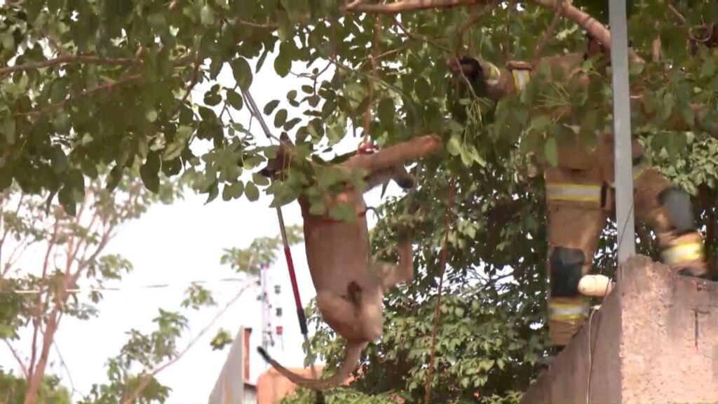 Minas Gerais- Uma onça-parda foi resgatada após ficar presa a cerca de 20 metros de altura, no topo de uma árvore, no interior de Minas Gerais. O felino foi avistado por uma criança que brincava com a avó no quintal da casa onde a árvore estava localizada.