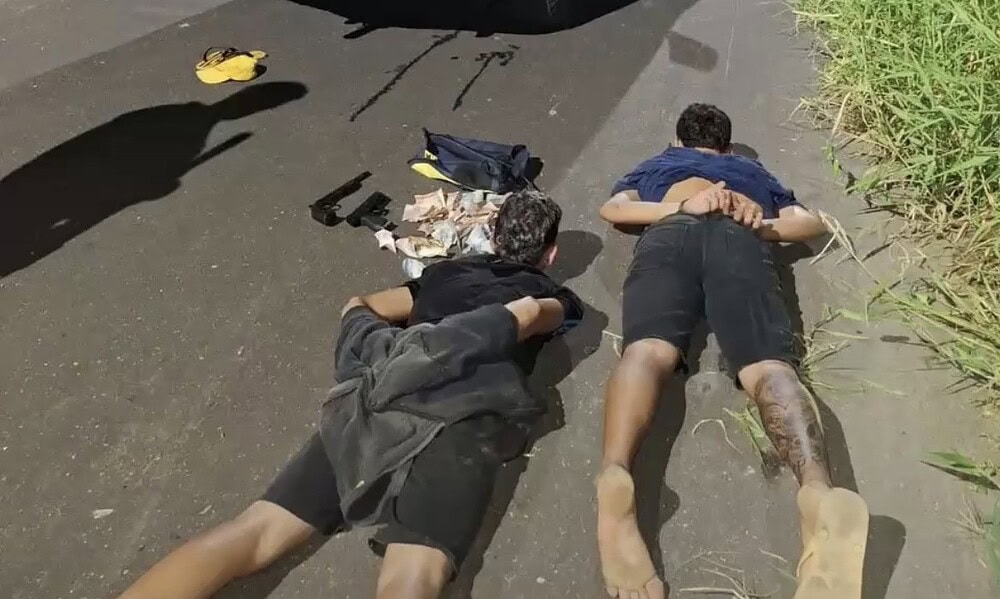 Com os adolescentes, a polícia encontrou uma escopeta calibre 36 com cano serrado, um cartucho do mesmo calibre intacto, uma réplica de pistola airsoft e todo o dinheiro roubado, totalizando R$ 979. Parte do valor estava escondida na roupa íntima de um dos menores, e o restante, dentro de uma mochila.