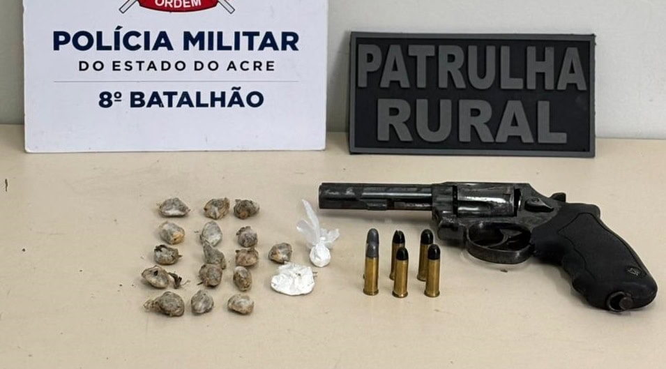 Um homem foi preso e outro conduzido para averiguação, após uma ação que resultou na apreensão de drogas, munições e um revólver calibre .38 em uma residência no Ramal do 15, zona rural de Sena Madureira. O caso foi divulgado pela Polícia Militar nesse sábado, 22.