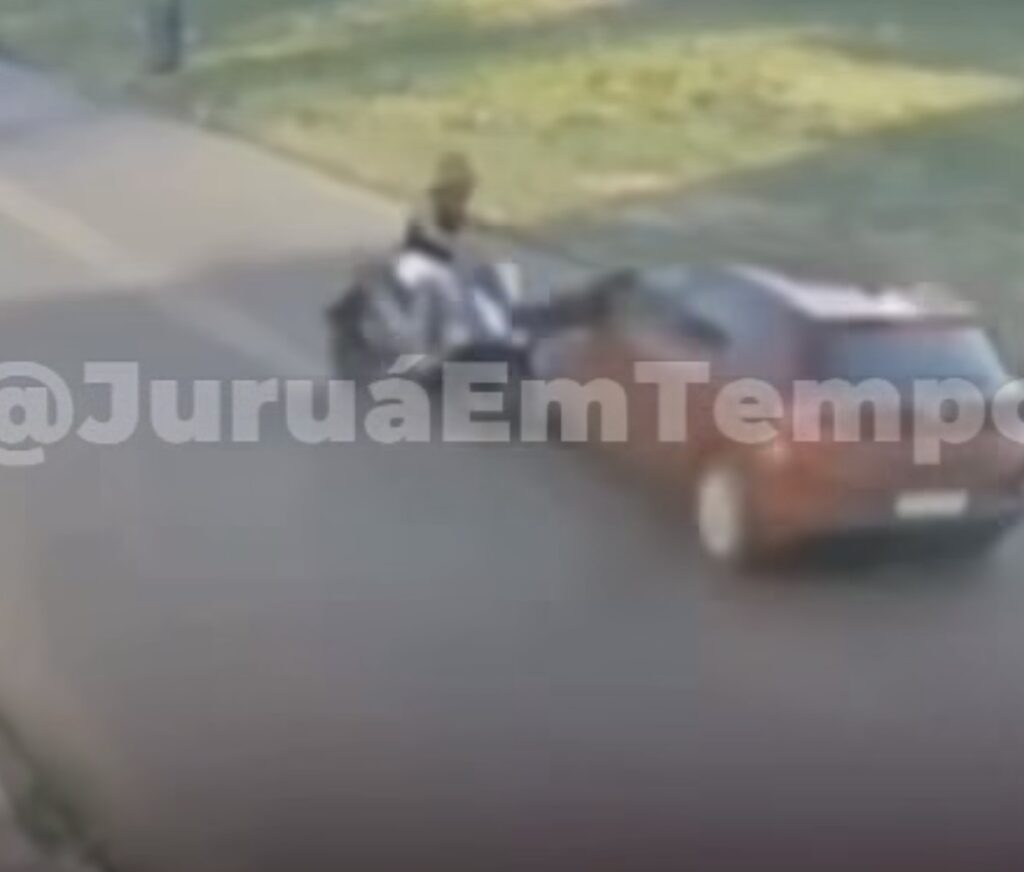 Um acidente registrado na tarde deste sábado (8) deixou um motociclista ferido no bairro Tropical, em Rio Branco. A colisão entre a moto e um carro foi flagrada por câmeras de segurança instaladas na região, que captaram o momento exato do impacto.