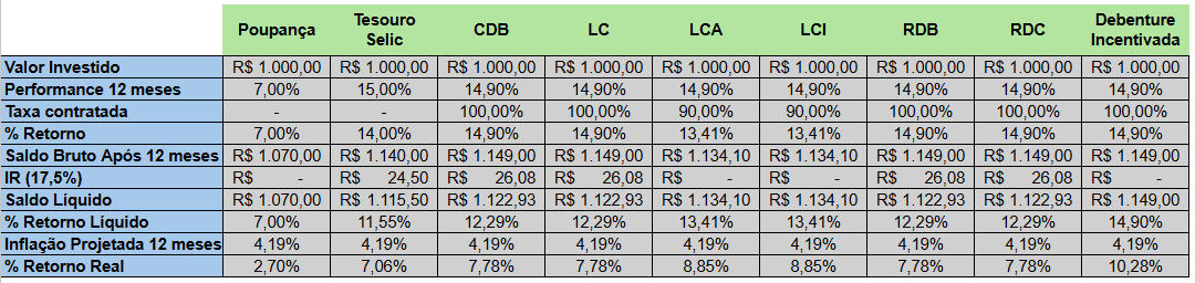 Como mostra a tabela, após o desconto da inflação e do imposto de renda (IR) sobre cada aplicação, saltam na frente o LCI, que é isento de tributos. Também isenta, a poupança levaria R$ 1000 a um rendimento de pouco mais de R$ 70. Já em CDBs, LCI e LCA, é possível superar os R$ 120.