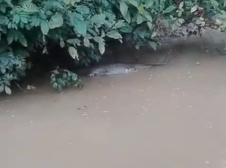 Vídeo feito por cinegrafista amador mostra o momento em que o animal, com a barriga visivelmente cheia, desliza pelas águas do rio; imagens chamaram atenção nas redes sociais.