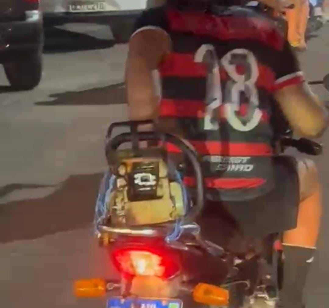 E em Cruzeiro do Sul, cada um “comemora do jeito que quiser”. Foi o caso deste torcedor que foi visto com um motor (sabe-se lá de quê), na garupa de uma moto, pra aumentar a potência do barulho na carreata.