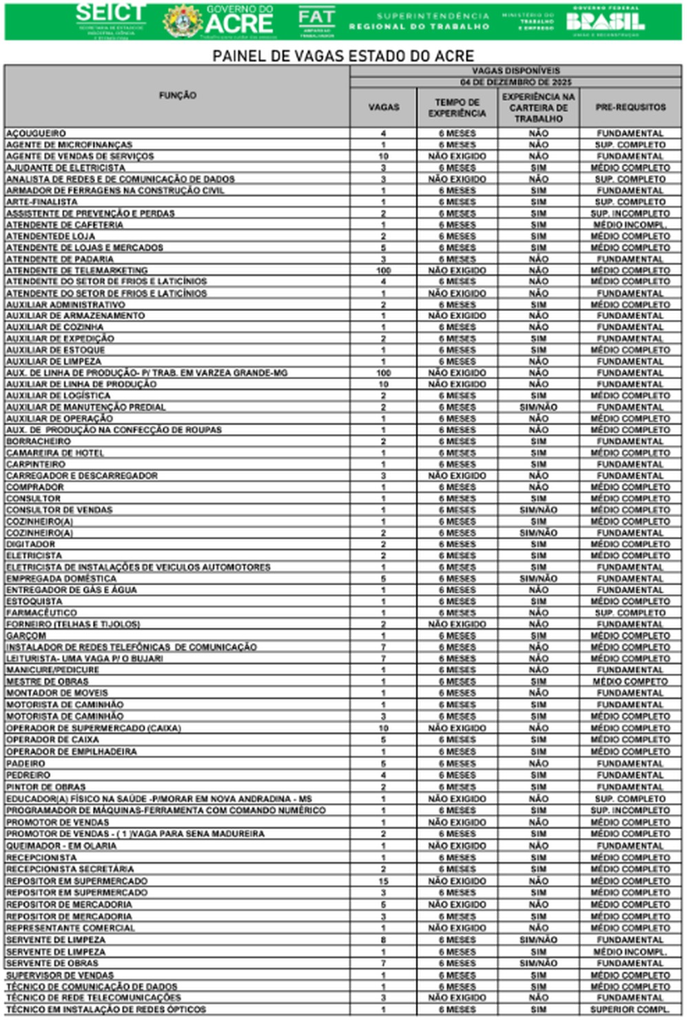 O Sistema Nacional de Emprego do Acre (Sine) oferta 752 vagas de empregos nesta sexta-feira, 5, para candidatos com nível fundamental e médio. Há vagas para pessoas com deficiência. (veja abaixo)