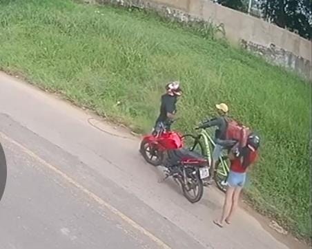 Câmeras de segurança registraram o momento em que um casal, em uma motocicleta de cor vermelha, assalta um ciclista entregador na manhã desta quinta-feira (8), por volta das 8h, na Travessa Guarani, no bairro Aviário, em Rio Branco. O crime ocorreu nas proximidades do muro do Campo do Independência.