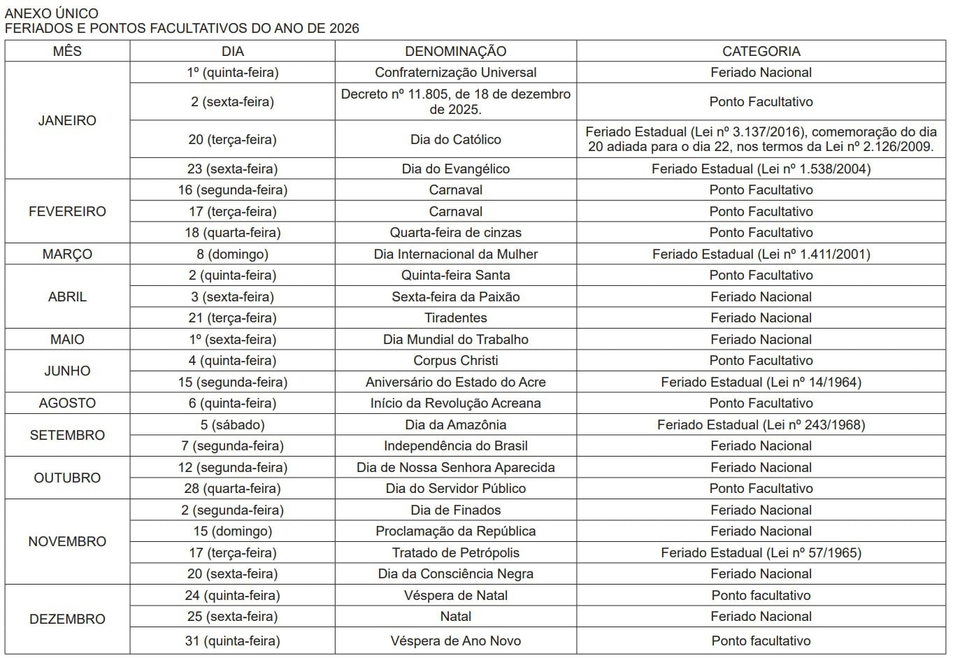 A última semana de janeiro começou a todo vapor após o feriado prolongado para o funcionalismo público acreano. Para quem já planeja o próximo momento de desconexão da rotina, a boa notícia é que a próxima folga de 2026 ocorre já em fevereiro.