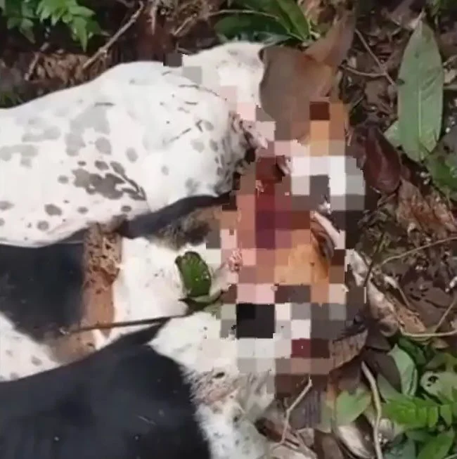 Uma foto enviada a nossa redação mostra os cachorros mortos e com os corpos parcialmente devorados pela onça. O caso tem ganhado repercussão no município.