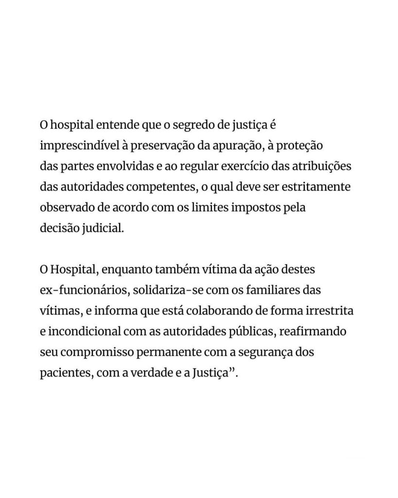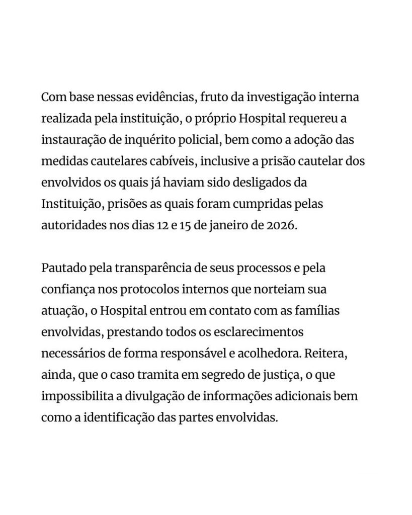 O Hospital Anchieta, por meio de nota oficial, reforçou que foi vítima do esquema, solidarizou-se com as famílias e afirmou estar colaborando integralmente com as autoridades. A instituição destaca que o caso tramita em segredo de justiça.