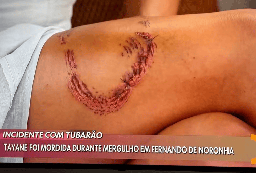 A advogada Tayane Dalazen, mordida por um tubarão-lixa durante um mergulho em Fernando de Noronha, participou do programa Encontro nesta terça-feira (13). Ela mostrou o ferimento, falou sobre o tratamento e relatou como foi o incidente. “É uma dor muito forte, mas não é paralisante’, disse a turista.