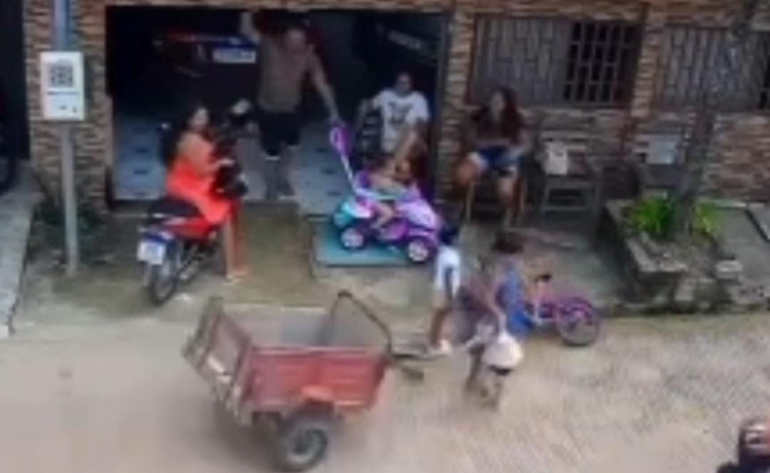 As imagens, que circulam nas redes sociais, mostram quatro adultos conversando em frente a uma residência enquanto três crianças brincam próximas ao meio-fio. Em determinado momento, uma motocicleta preta passa pela via, mas a carretinha – normalmente utilizada para o transporte de cargas – se solta do veículo e acerta em cheio as crianças.