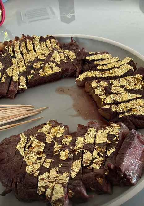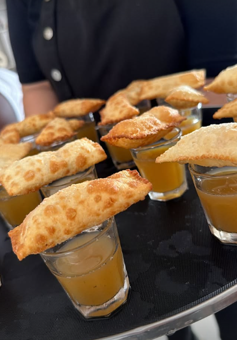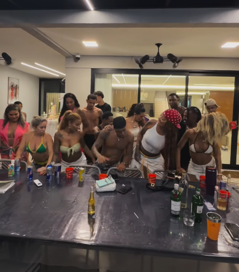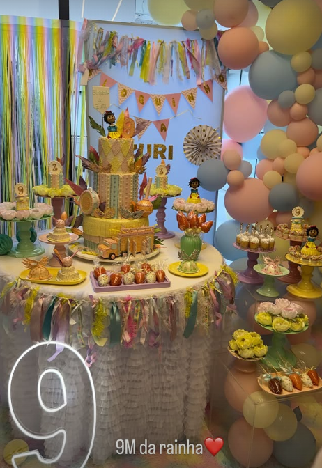 Entre os destaques do menu, um churrasco chamou atenção: as carnes eram finalizadas com folhas de ouro. Os convidados também saborearam pastéis servidos com molhinho. A decoração seguiu o tema “Bloquinho da Zuri”, com referências carnavalescas e uma mesa de bolo colorida e repleta de docinhos.