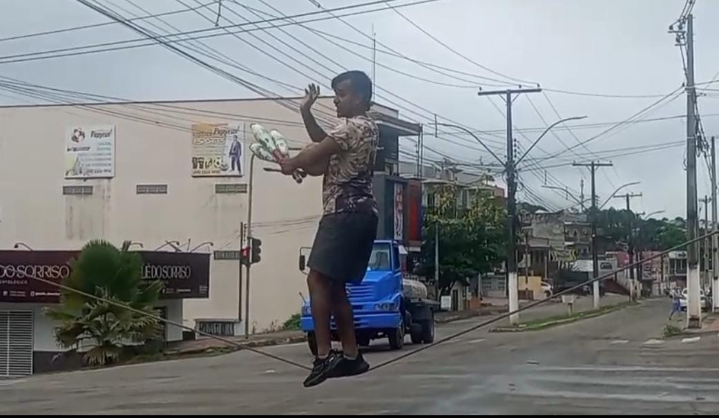 Malabarista argentino chama atenção nos semáforos de Cruzeiro do Sul ao realizar apresentações de equilíbrio e malabarismo em cima de corda. O artista é Davi Alejandro, de 28 anos, que vive no Brasil há seis anos e atualmente está no Acre, onde adquiriu um terreno na região do Pentecoste e pretende construir a própria residência.