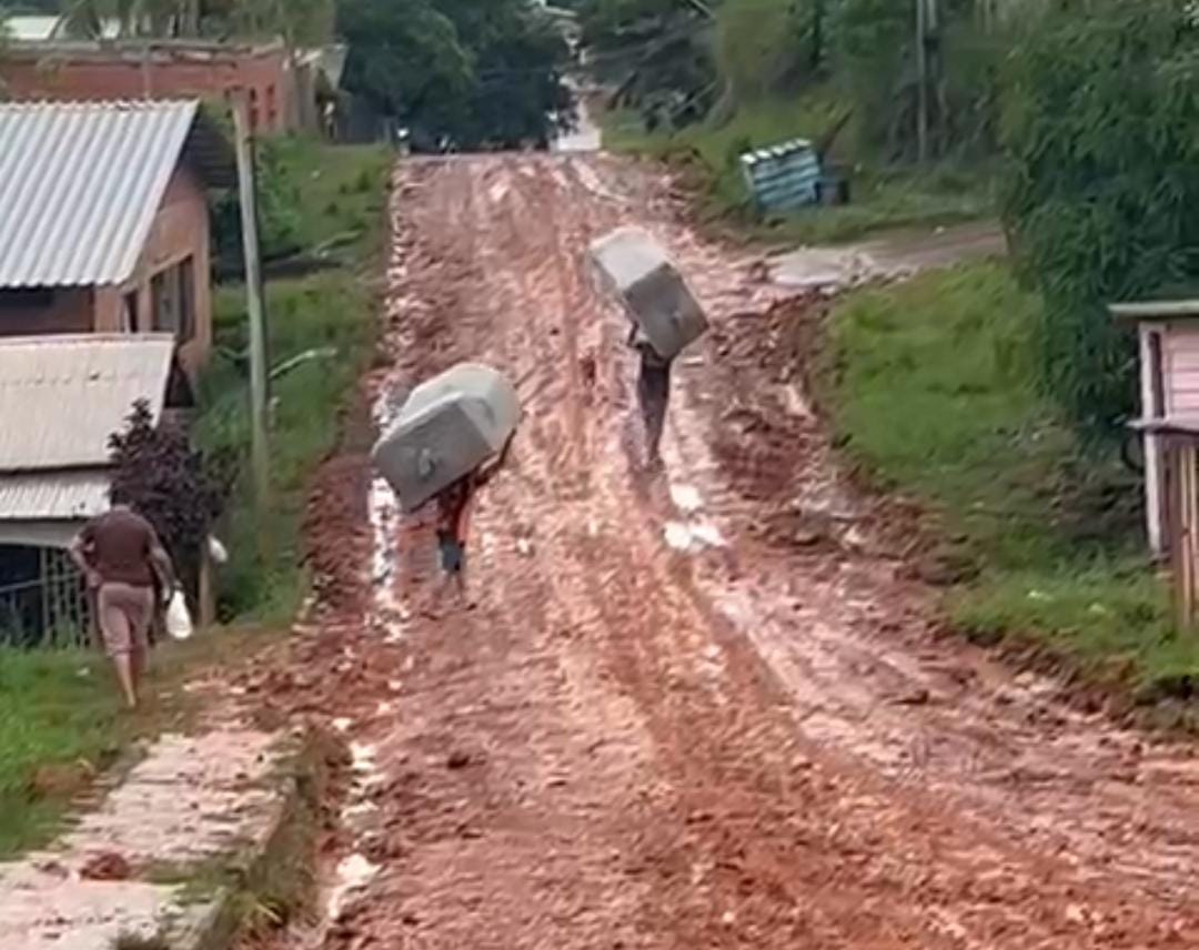 Um vídeo registrado em Ipixuna chamou atenção ao mostrar um homem subindo uma ladeira completamente tomada pela lama, carregando um sofá nas costas, no bairro do Morro.