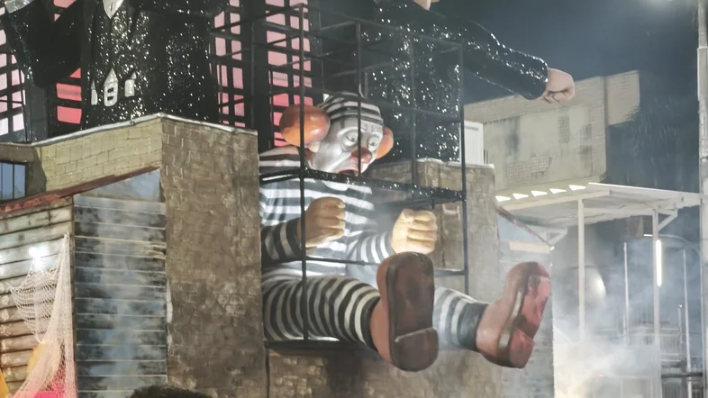 O auge da referência foi na quarta alegoria da escola, que fazia referência aos “retrocessos na política pública” de outros governos. No final do veículo, o palhaço Bozo – personagem popular usado como apelido ao ex-presidente – aparece preso, com uniforme de presidiário e a tornozeleira eletrônica danificada. A prisão de Bolsonaro, inclusive, se deu após o ex-chefe do Palácio do Planalto tentar tirar a tornozeleira em novembro do ano passado.